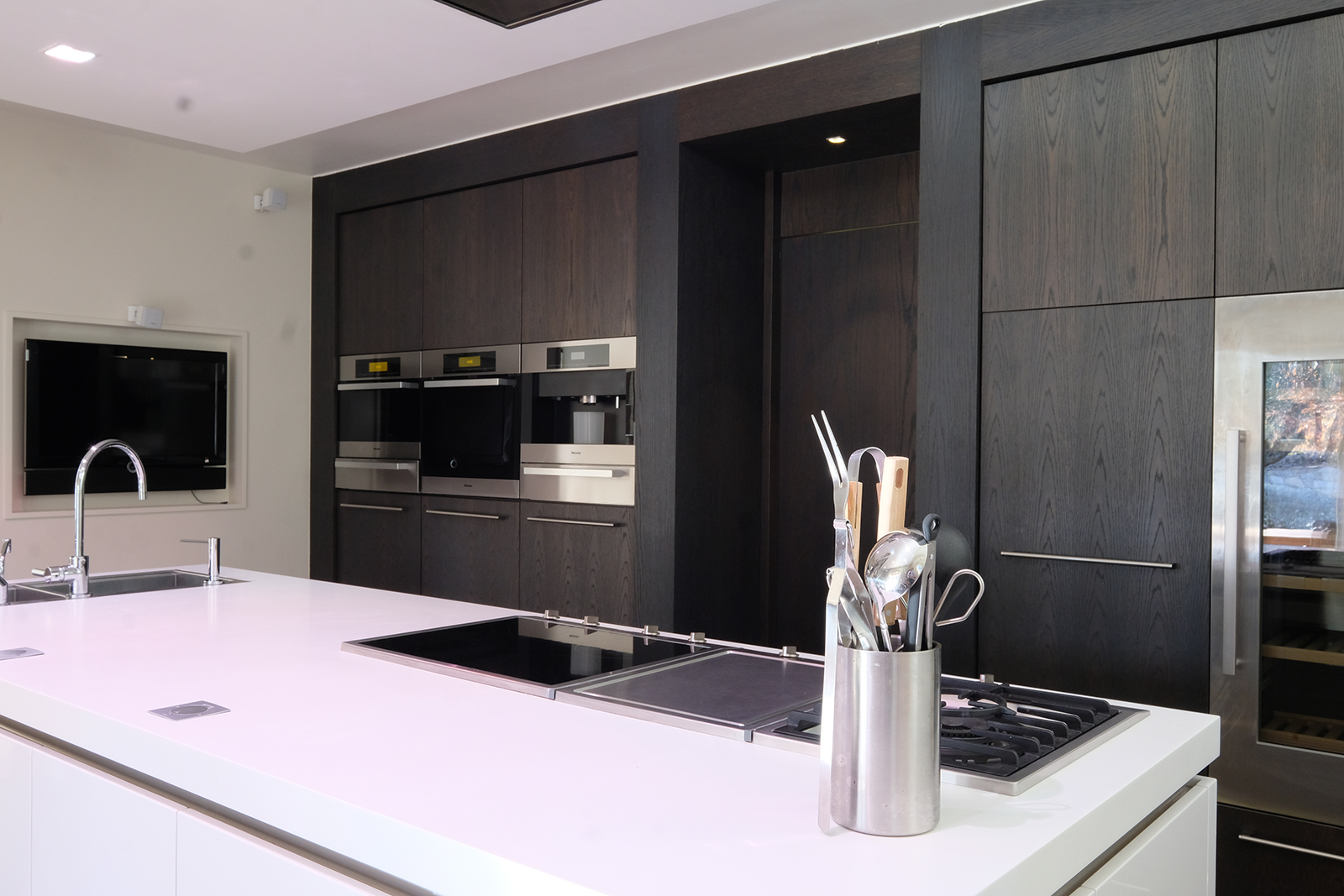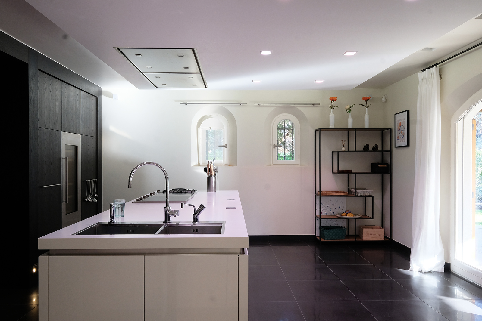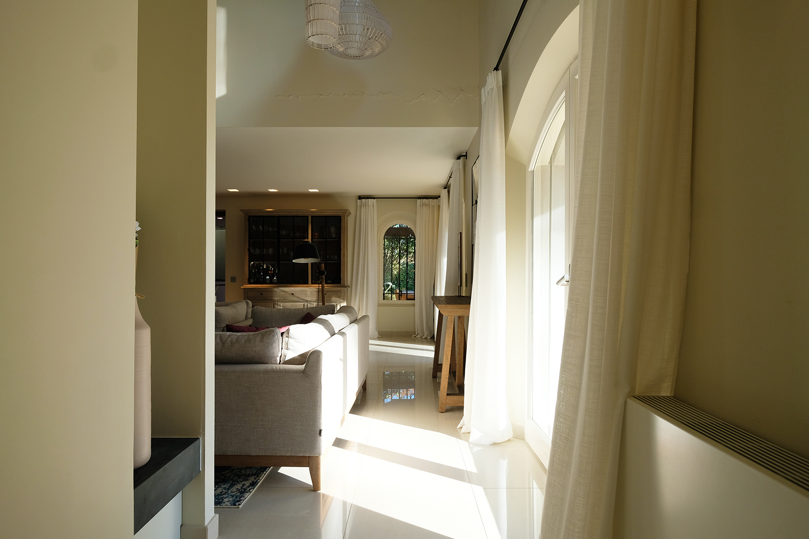 Luxury villa with serene, bright decor. Spacious open living and kitchen.