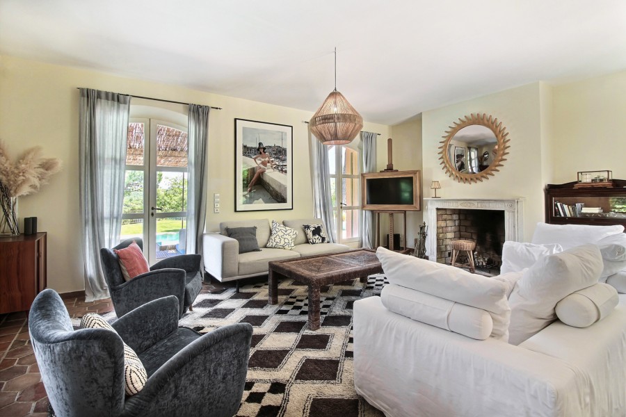 On the ground floor you will find the inviting living room with comfortable seating arranged around the large fireplace. The living room is openly connected to the dining area. From both the living and dining room, French doors open directly onto the covered terrace, the swimming pool, and the beautifully landscaped garden. The villa is fully air-conditioned, ensuring a pleasant indoor climate even in the height of summer.