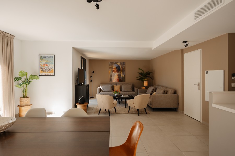 You will be pleasantly surprised by the spacious garden that this semi-detached house offers. The sun exposure is excellent, and there are several luxurious seating areas spread throughout the garden. On the terrace in front of the living room, there is a dining table with 8 seats. An electrically operated sunshade provides delightful shade...