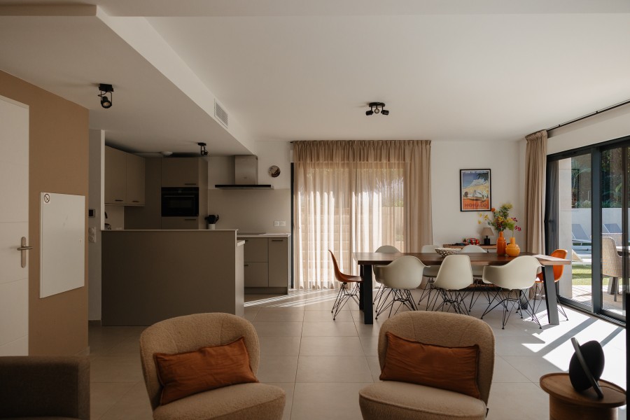 This modern corner house offers a stylish and spacious living environment. The living area is bright and open, featuring a comfortable seating area and a designer dining table that seats 8 people – perfect for cozy dinners. The adjacent open kitchen is fully equipped with high-quality appliances, including a dishwasher, oven,...