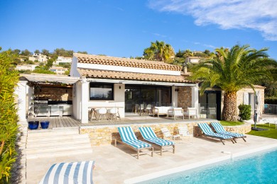 The villa has 4 bedrooms and 3 bathrooms, two of which are en-suite. All bedrooms are equipped with air conditioning. Bedroom 1 has a double bed (180x200), and the bathroom is en-suite (shower/bathtub and toilet). French doors provide direct access to the terrace. The view of the Mediterranean Sea is a delightful feature.