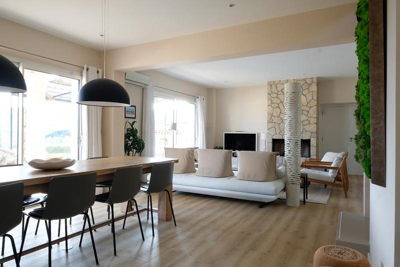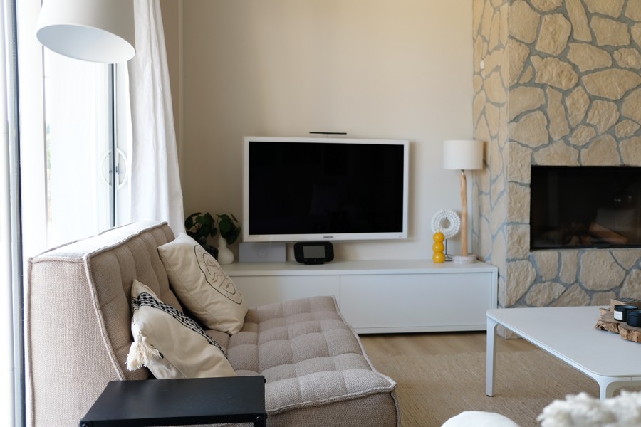 Both from the living area and the kitchen, you have a beautiful view of the terrace and the swimming pool. From the seating area, you can also enjoy a small sea view. The seating area is equipped with a television that allows you to watch your favorite programs via Chromecast. Additionally, there's a Wii U and a DVD player available. Once you're connected to the Wi-Fi network, you can use your own Sonos account to enjoy the speaker system and play your own music.
