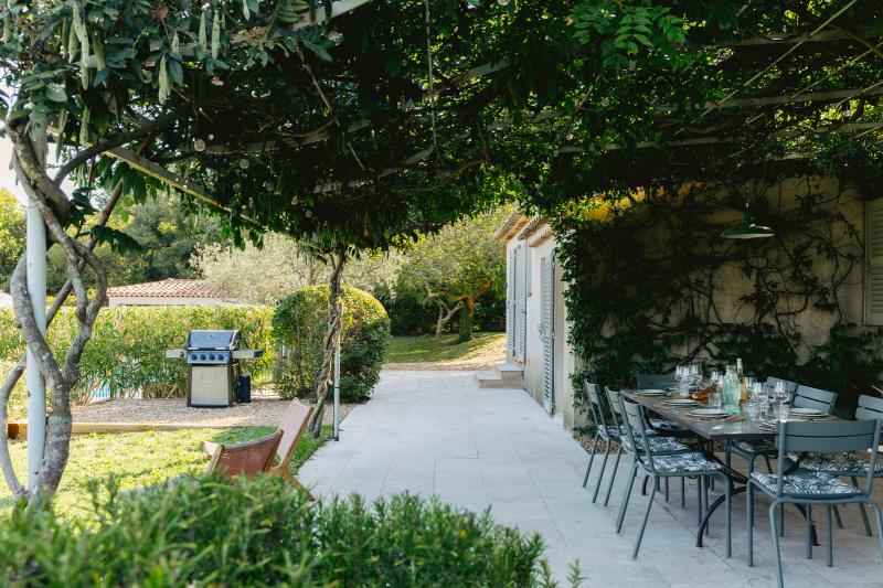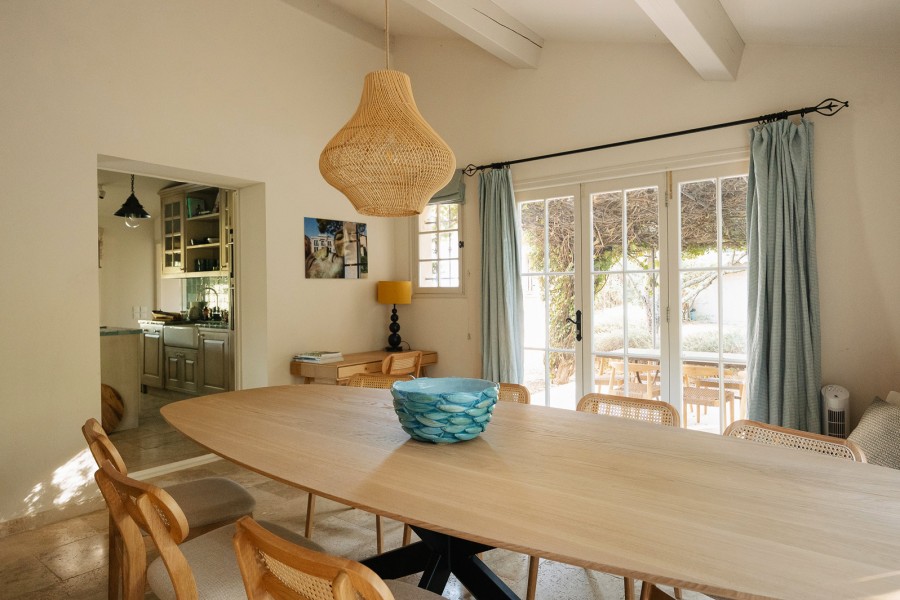 A lovely feature is the separate dining room with a modern, oval table for 10 people. Double garden doors on both sides of the room create a bright, open atmosphere. One set opens onto a charming terrace beneath a leafy pergola – an inviting place for a quiet breakfast or evening meal.