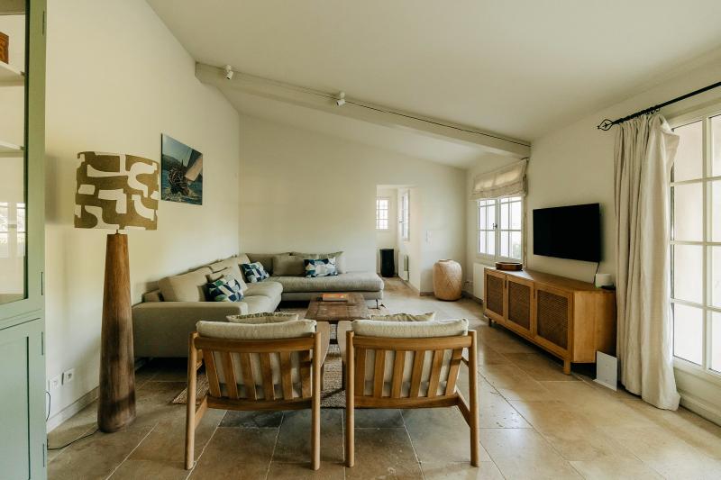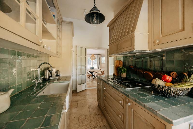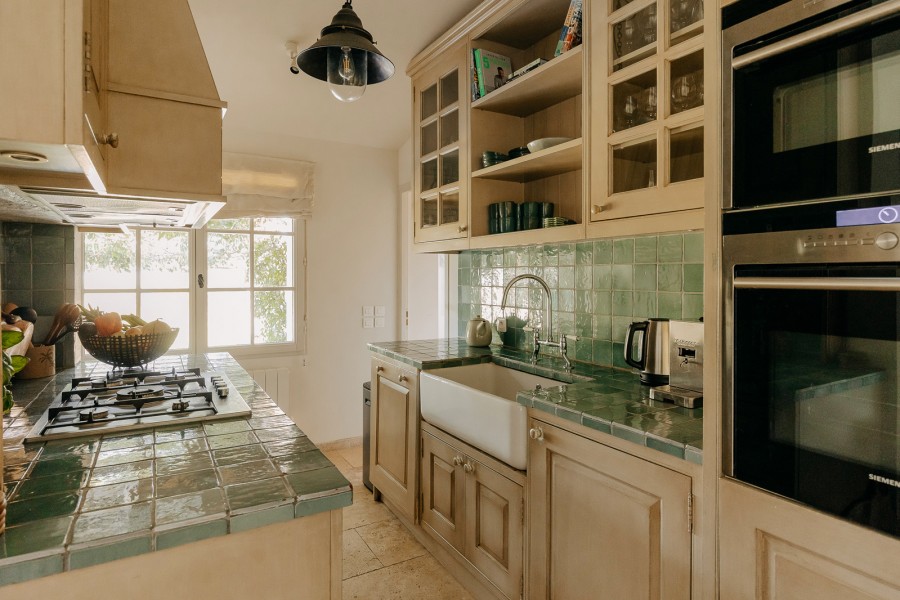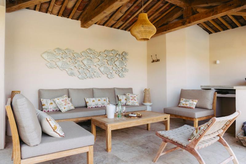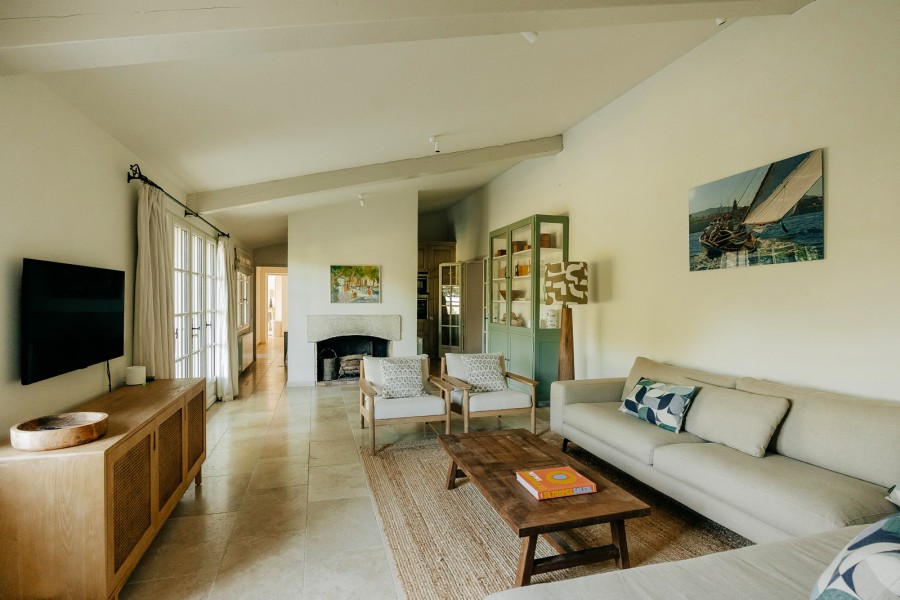 The villa features a stylish and comfortable living room, with the eye-catcher being the extra-large, soft lounge sofa – perfect for relaxing evenings. French doors open directly onto the terrace, where a large dining table with chairs is located. Thanks to the lush Wisteria and Jasmine growing over the pergola, this is a delightful, sheltered spot to enjoy the outdoors.
