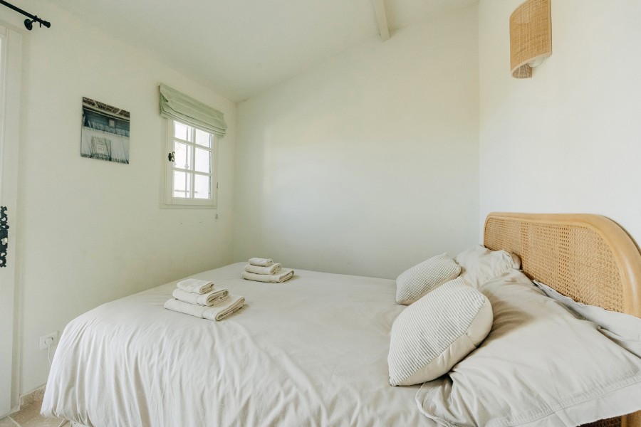 Bedroom 2, is next to bedroom 1. It is a smaller bedroom with a double bed of 140x200 cm. This room uses the bathroom with a shower and sink located directly across the hallway.