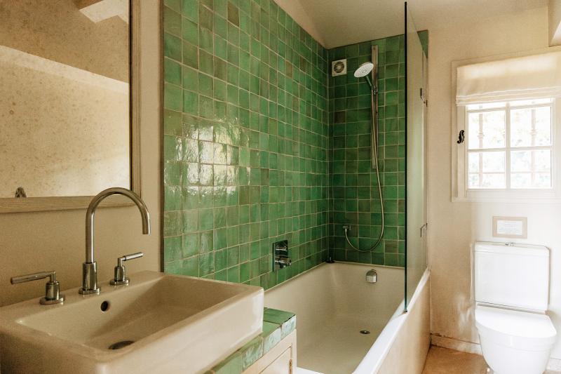 Bedroom 1, is the spacious master bedroom with French doors opening to the garden and pool. The en-suite bathroom includes a bathtub, washbasin, and toilet, plus built-in wardrobes. The double bed measures 180x200 cm.