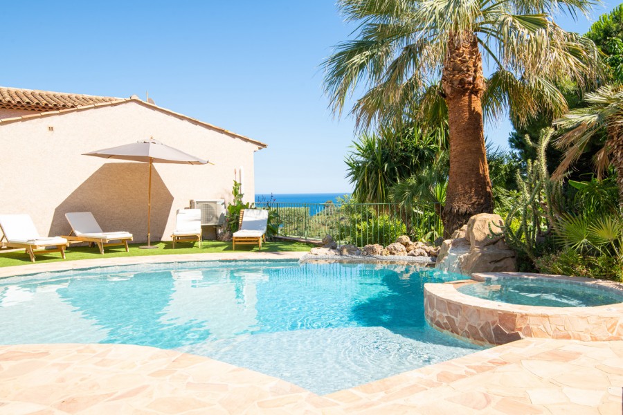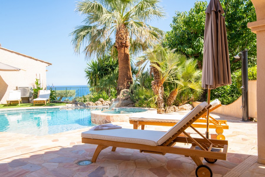 A stunning villa with breathtaking sea views, spread over three levels: The parking level serves as the entrance to the villa and includes a stylish living room, an open kitchen, a bedroom with an en-suite bathroom, and a private swimming pool. The lower level features three additional bedrooms, each with its own bathroom, as well as a...