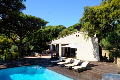 The villa features four luxurious bedrooms and three bathrooms. All bedrooms offer direct access to a terrace via French doors.
