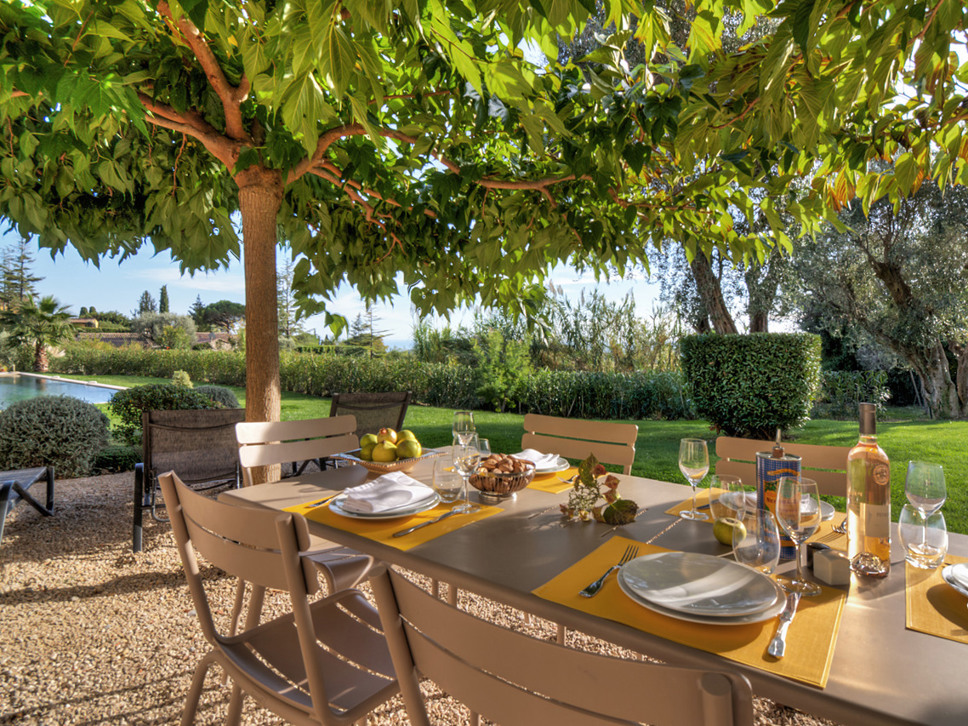 The villa is situated on a wonderfully spacious, almost flat terrain. You enter the garden via the ground floor. On the terrace (pebbles) you will find a dining table with chairs. The Plane trees provide plenty of shade for a delicious lunch or dinner (BBQ is available). A lounge set cannot be missed on this terrace!