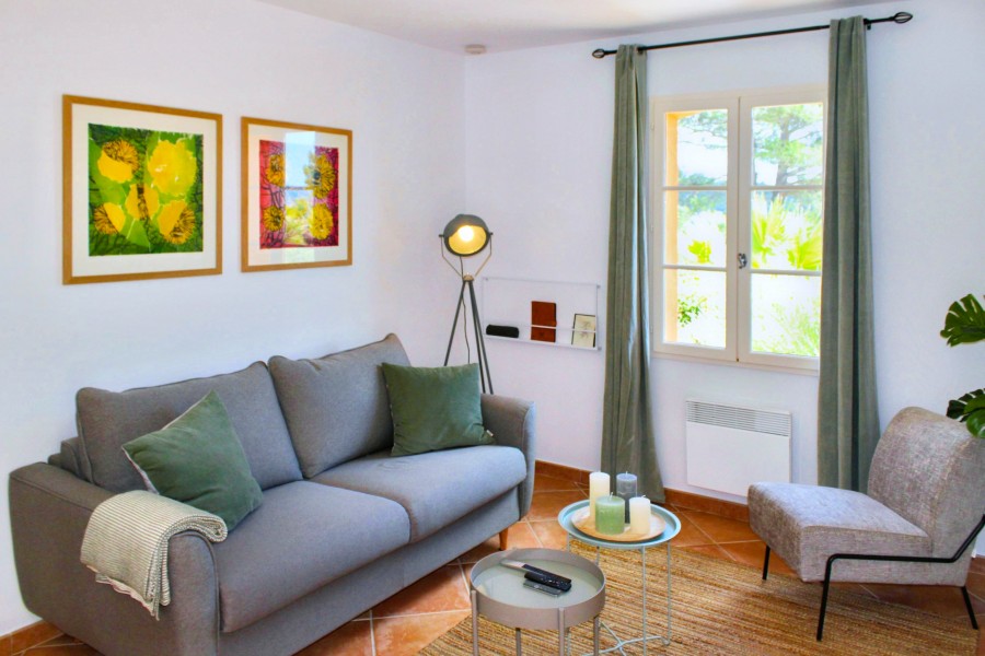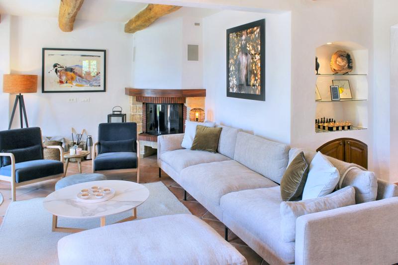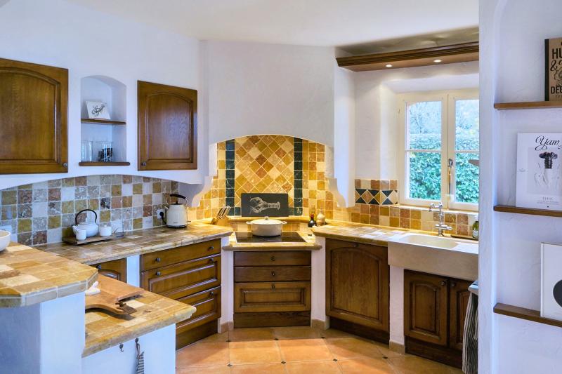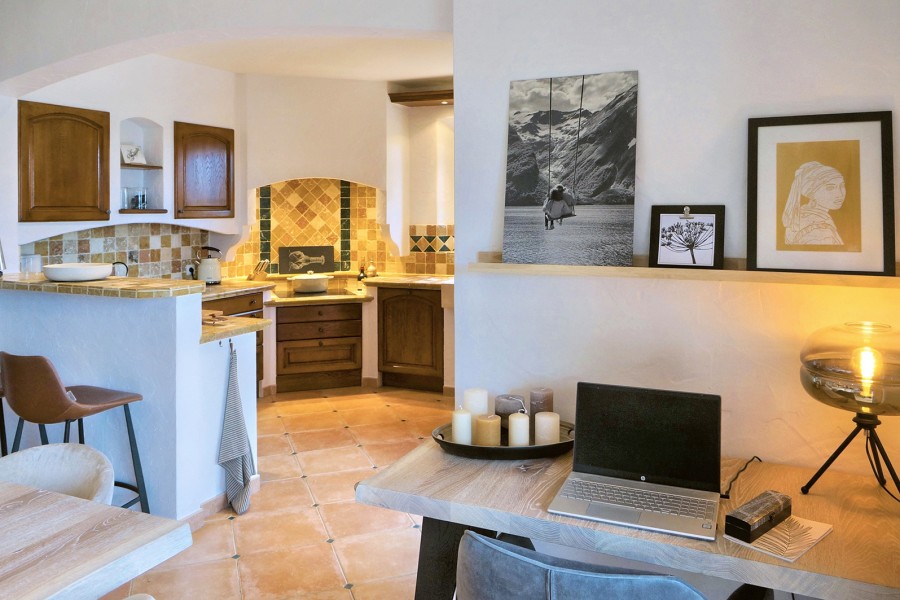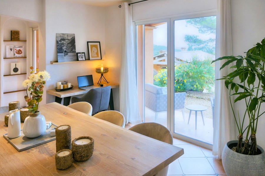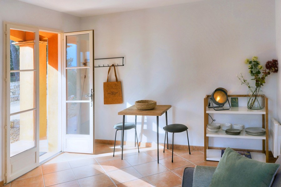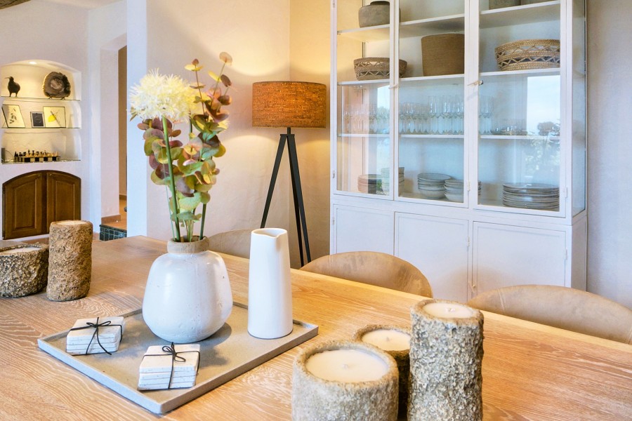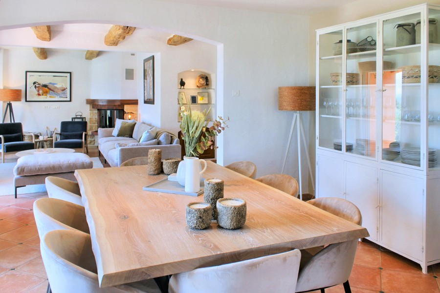 The living area is generous and inviting, furnished with comfortable seating. Several French doors open onto the terrace, creating an easy indoor-outdoor flow. The dining table is extra large (XL), ideal for long, sociable meals. Adjacent to the living room is the traditional kitchen, fully equipped with a dishwasher, 4-zone induction hob and microwave.