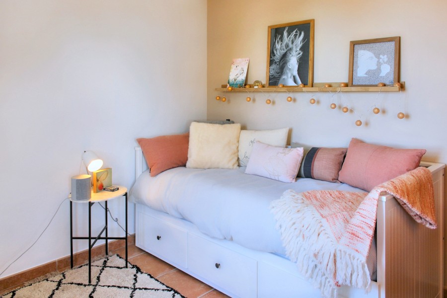 Bedroom 3 is on the first floor and is a children’s bedroom with two single beds (2x90x200). It shares a bathroom (shower, washbasin and toilet) with Bedroom 2. The bedroom has air conditioning.