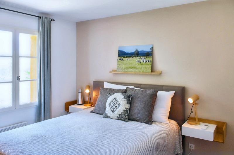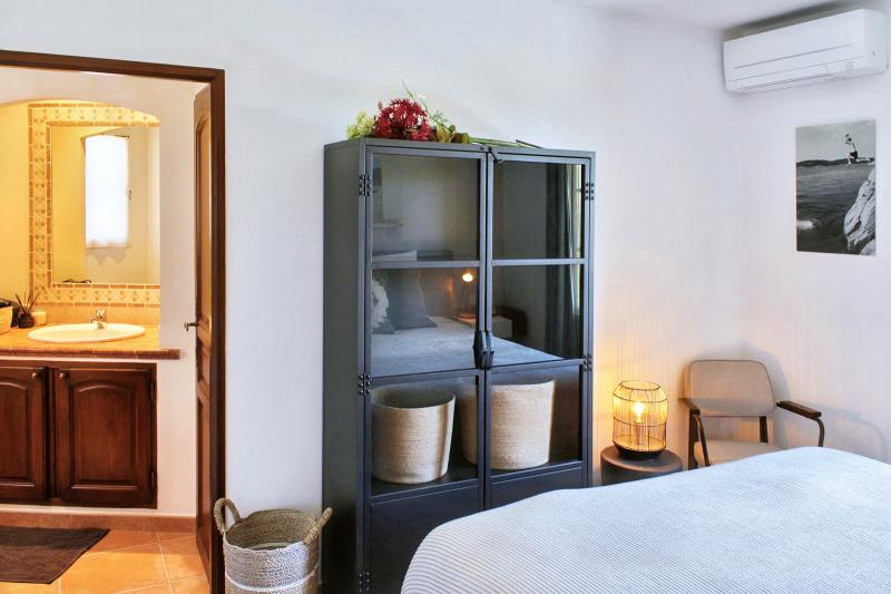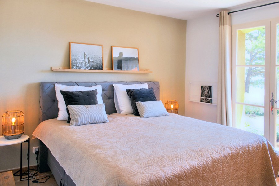Bedroom 1 is the master bedroom on the ground floor, furnished with a double bed (2x80x200). It has an en-suite bathroom with shower, double washbasin, bathtub and toilet, and offers direct access to the garden. The bedroom has air conditioning.