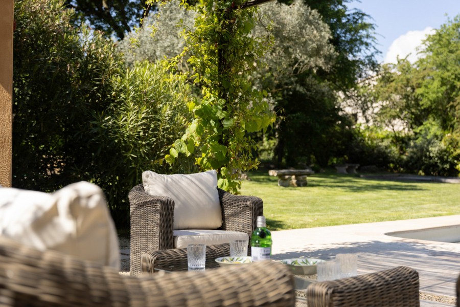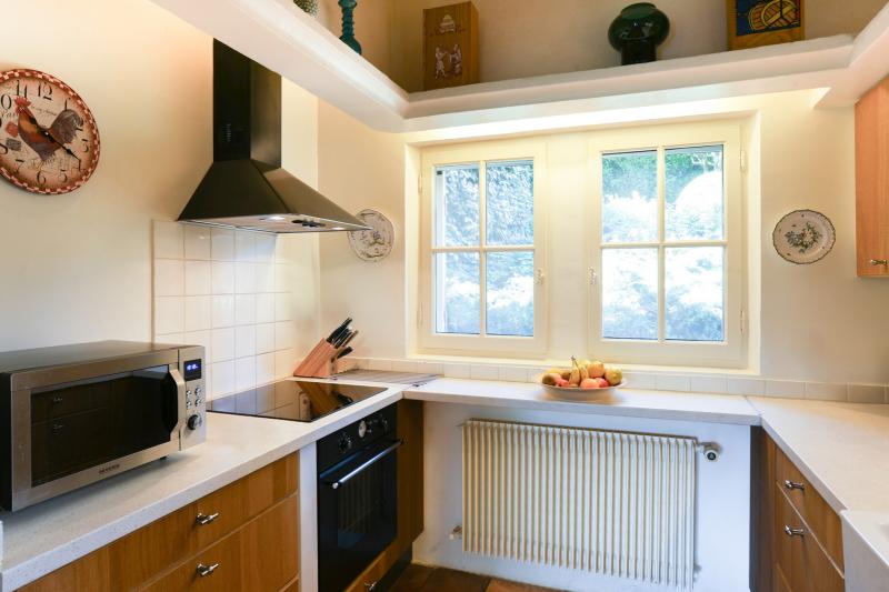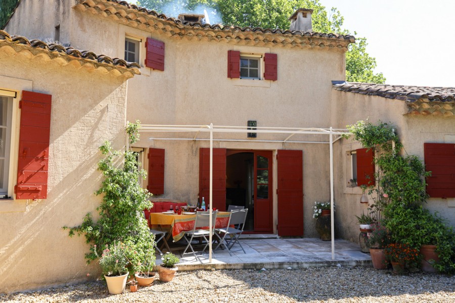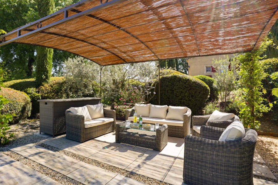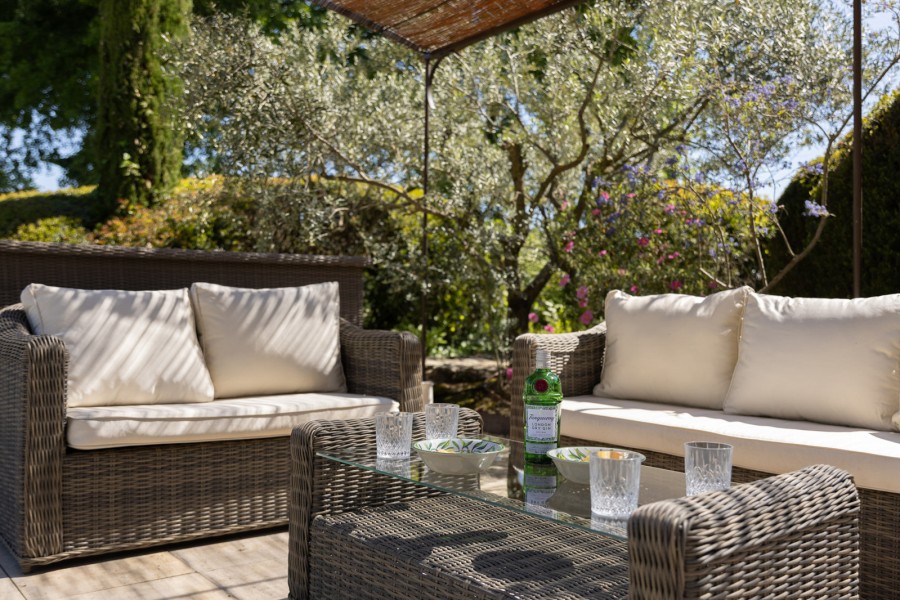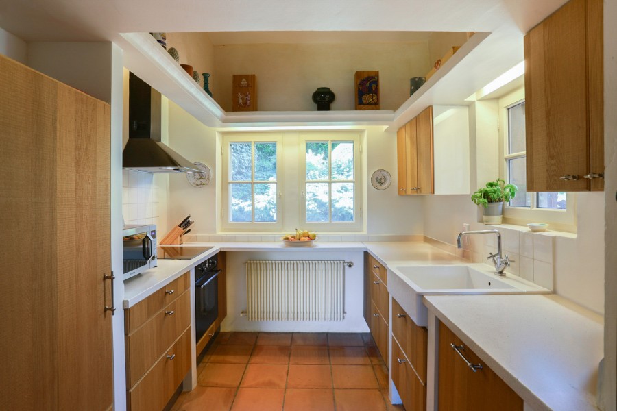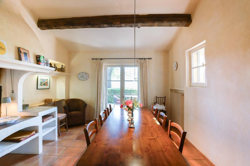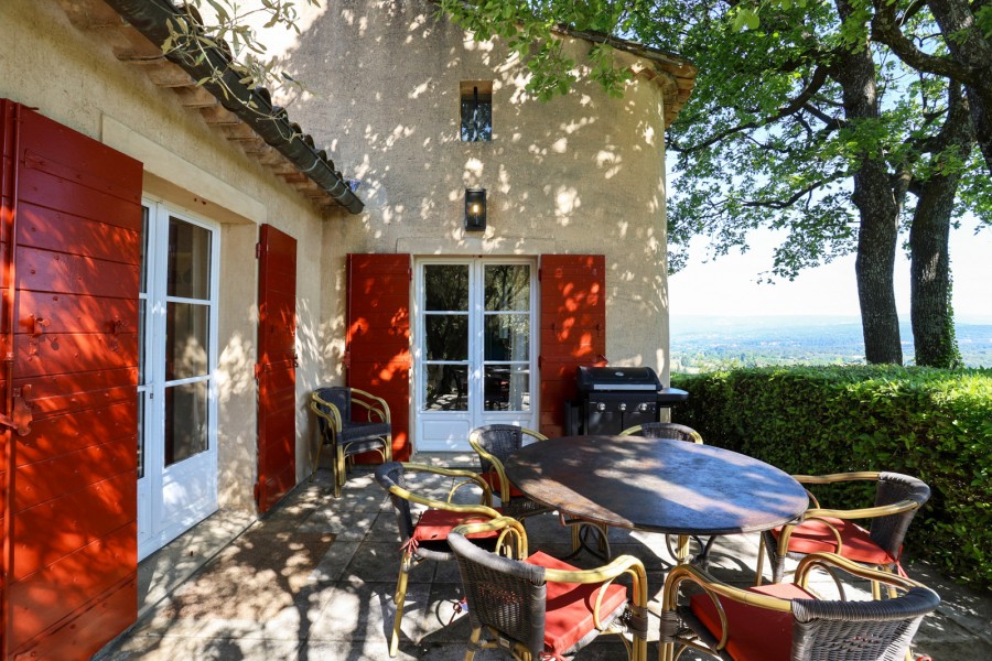 From the hall, you enter the spacious dining room and kitchen area. Here you find a long table with 8 chairs. The kitchen is fully equipped (fridge, stove, electric oven, dishwasher, toaster, coffee maker). Several electric tools serve well for preparing good meals. In a separate pantry, there is a second fridge/freezer. By the dining room, there is a large, attractive terrace with an olive tree overlooking the valley (umbrella, table and 8 chairs). From here, you have access to a terrasse framed by a bed of lavender, overlooking the valley and another terrasse with table and chairs in the cool of the trees.