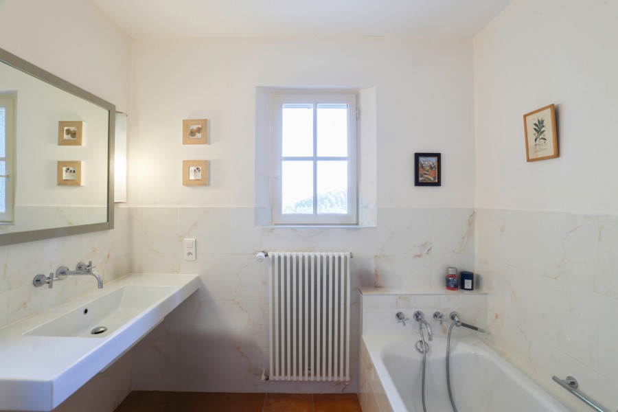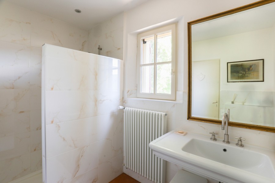 There are 3 bedrooms and 3 bathrooms. Bedrooms 1 and 2 are located on the ground floor in a separate aisle to the spacious living area. Bedroom 1 is the master bedroom. There is a double bed (2x90x200). You can find the TV (the only one in the villa) in a nice antique wardrobe. Bedroom 2 is located right next to it. Beds can be arranged either as 2 singles 90x200 or one double, as required. It also has a desk which allows you to work. Both bedrooms on the ground floor are facing the patio. Across the bedrooms, there is one bathroom with a shower and a separate toilet. Next to it, there is a second bathroom with a bathtub, plus an additional toilet, for optimal privacy.