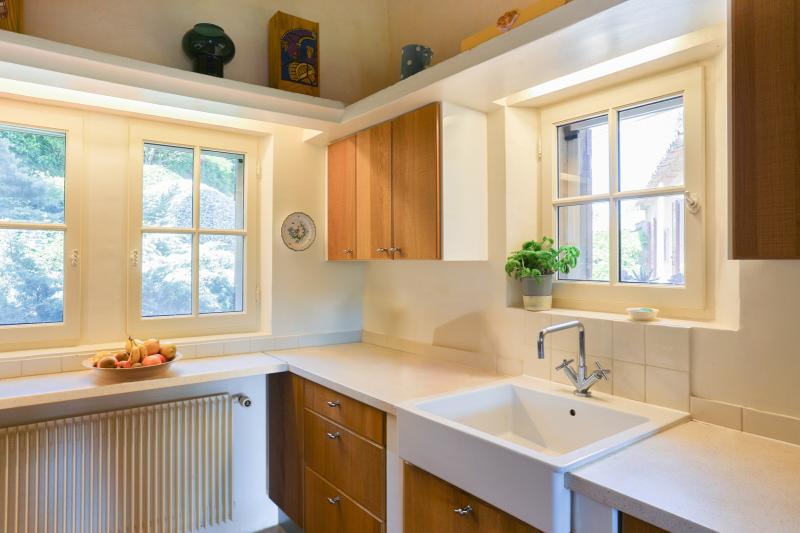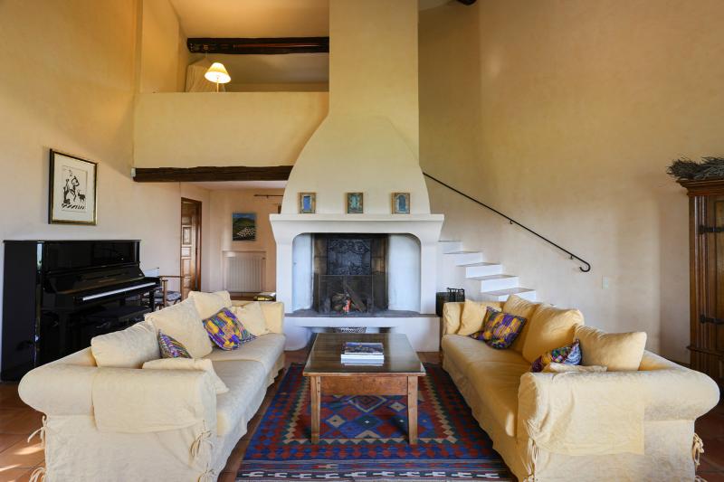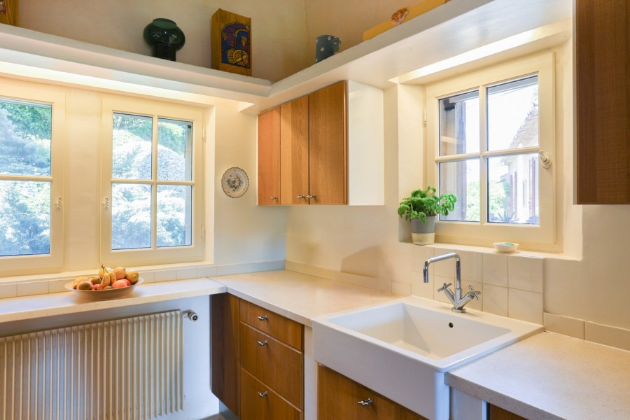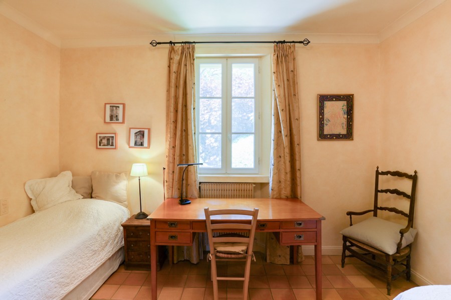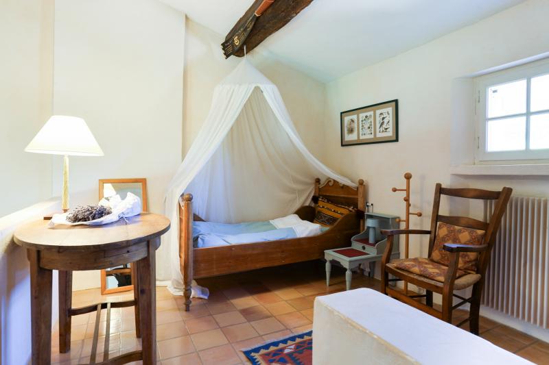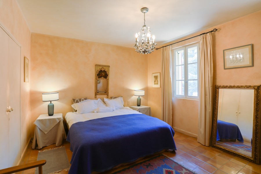 The house of traditional country charm is ~200m² spacious and attractively decorated in retro style. The walls are painted in Mediterranean style, in various shades of the local ocher. The lounge with 6m high beam ceilings is centered around a huge open fireplace, in front of which two sofas and antique furniture invite you to relax. A large window provides a panoramic view of the valley with vineyards and mansions. From the living room, a staircase leads you to the mezzanine, which has the atmosphere of an apartment within the house. There is an antique children’s bed (70x140), a bookcase, a small desk, and a chair. In the extension of the mezzanine, there is bedroom no. 3 and an ensuite bathroom with a shower.