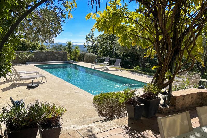Both the living and the kitchen provide access to the L-shaped terrace which extends over the entire width of the villa. Here you find several lounge chairs to enjoy the view over the hills and the village, with a nice glass of rose. From the kitchen you walk onto the covered terrace. Here is a dining table that sits 10 people. We really...