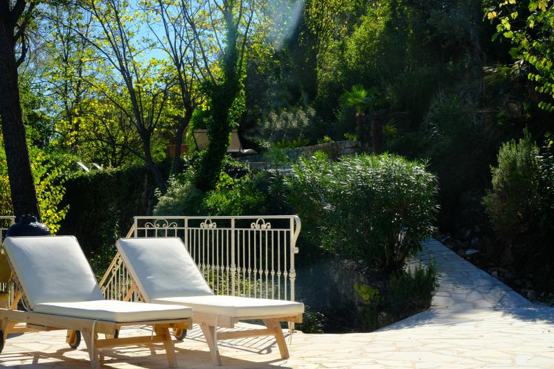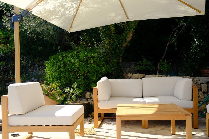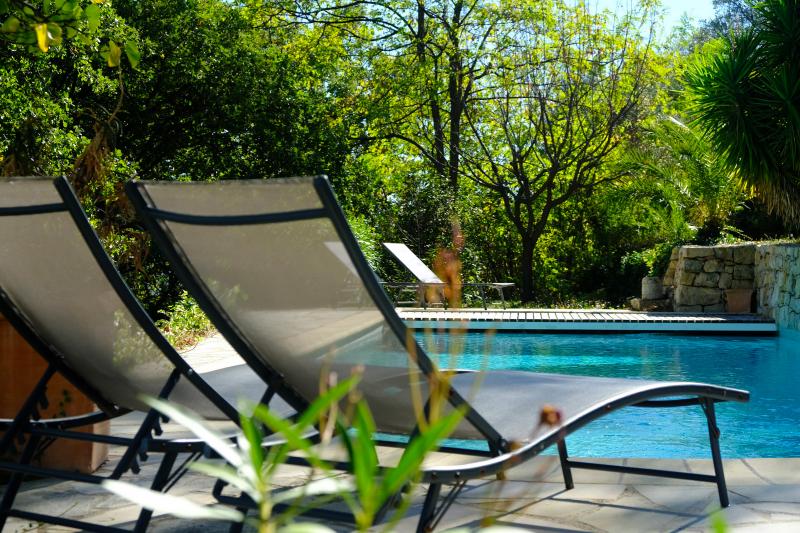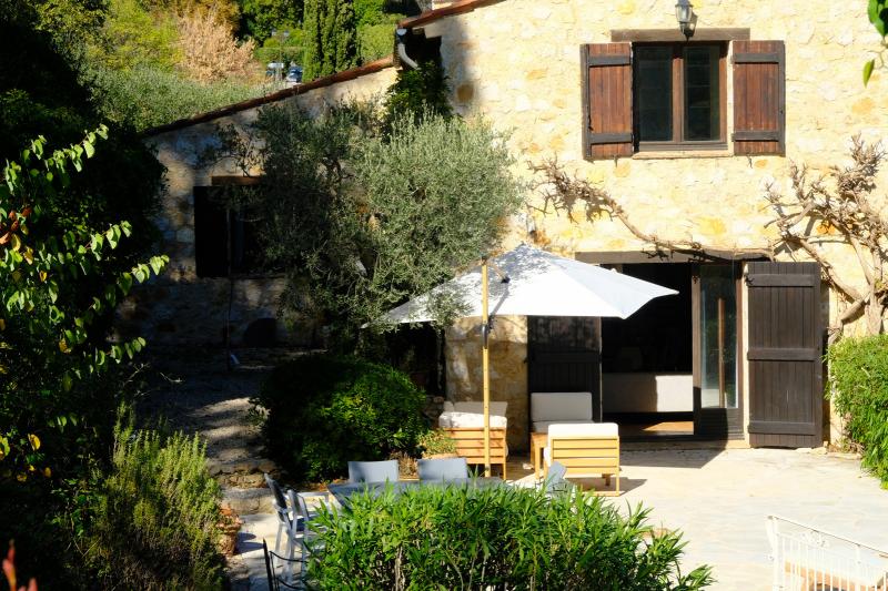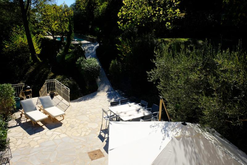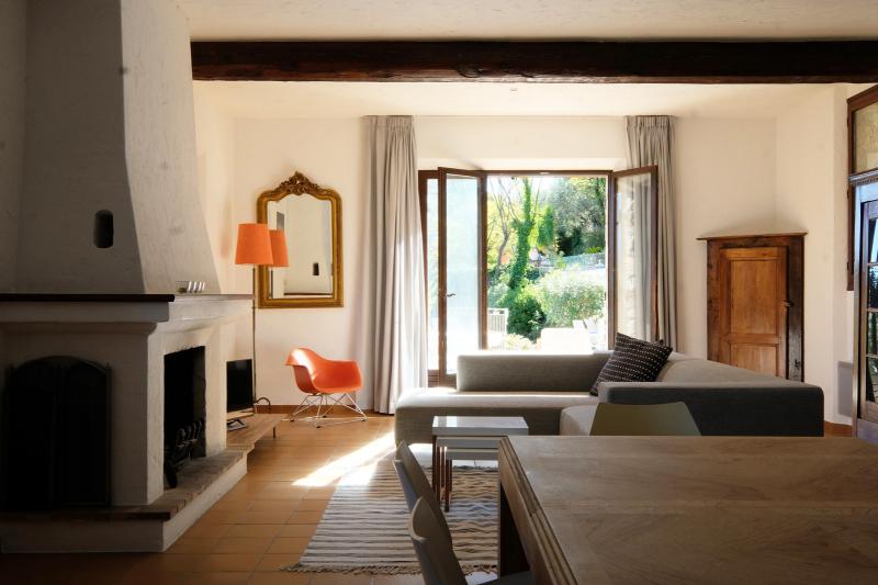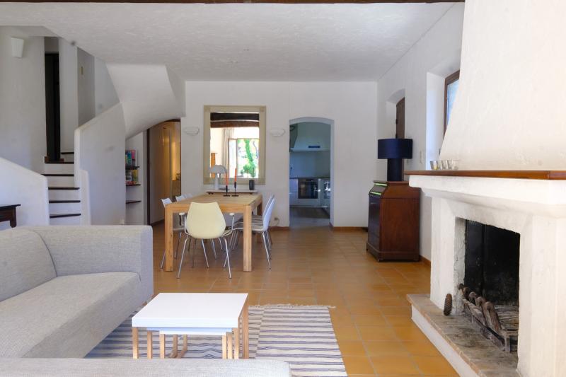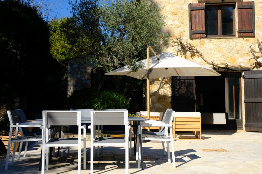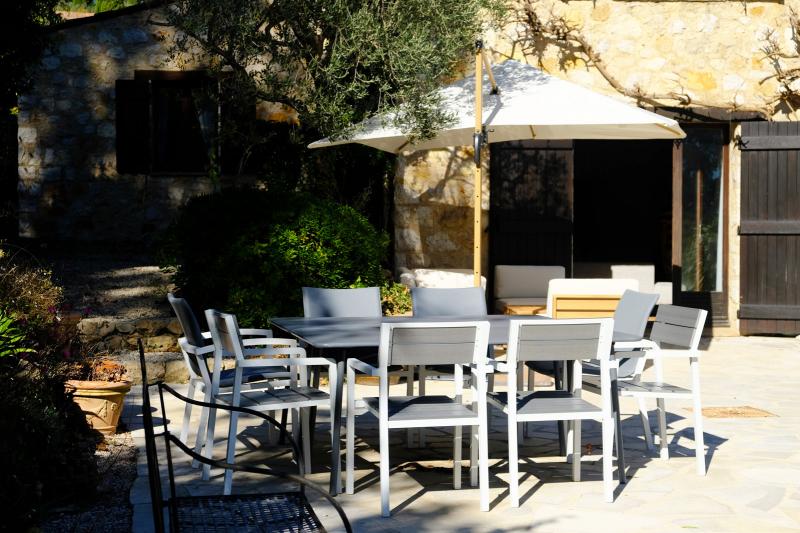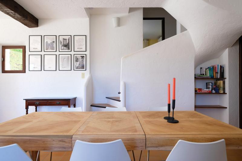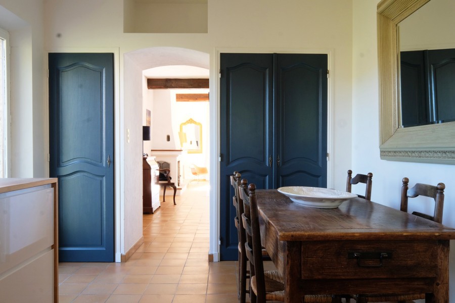 The dining table is generously sized and can seat up to eight people. The modern kitchen is fully equipped with a dishwasher, convection oven, induction hob, and microwave. A charming old Provençal wooden table with four chairs adds extra character to the space.