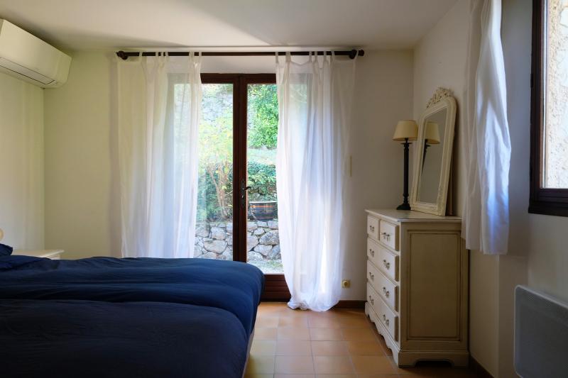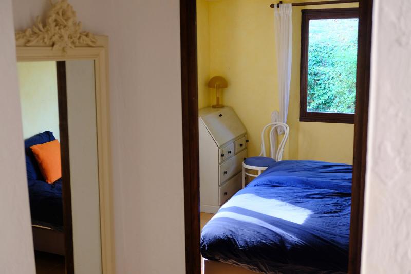 Bedroom 2 is also located on the first floor, on the opposite side of the shared bathroom. It has a double bed (180x200). This spacious bedroom offers access to a small terrace on the side of the house. Bedroom 2 shares a bathroom (with shower, bathtub, and sink) with Bedroom 1.