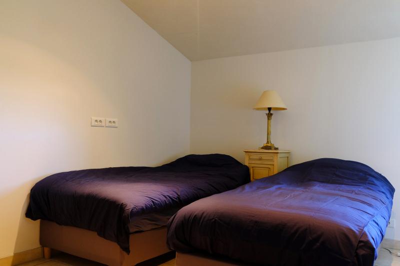 Bedroom 3 is located on the top floor. This bedroom offers two single beds (90x200) and an en-suite bathroom with walk-in shower, sink, and toilet.